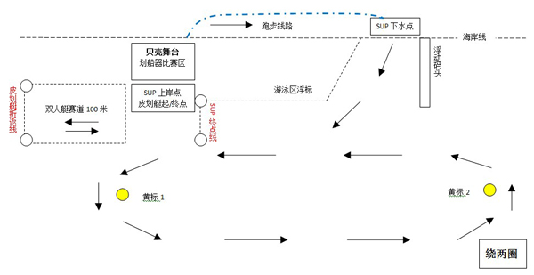 - 第三阶段:下海后立即开始海上SUP比赛(海上划行总长约3km。途中需绕一号和二号标各两次,最终冲过SUP终点线)。
