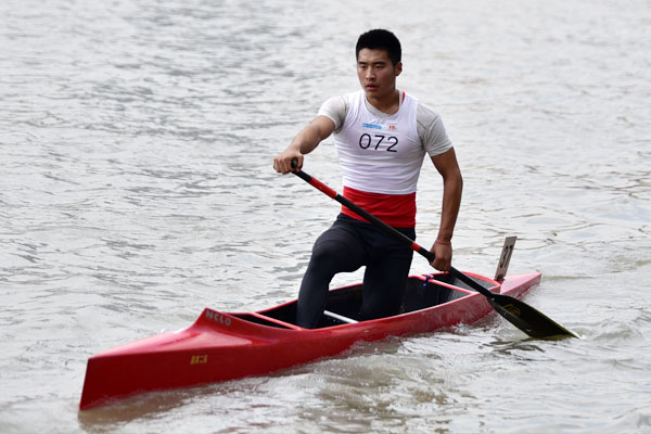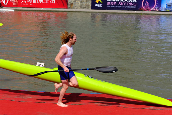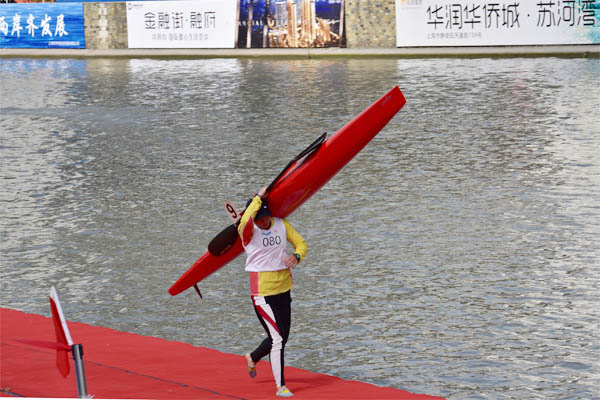 根据规则,比赛赛道还在陆地上设有100米跑道,参赛运动员在比赛过程中需持皮划艇完成陆上奔跑,呈现出水上、陆上交替行进的独特景象。