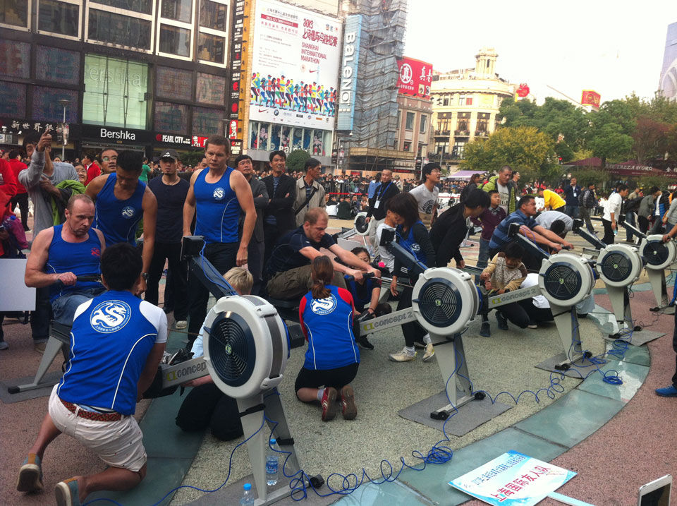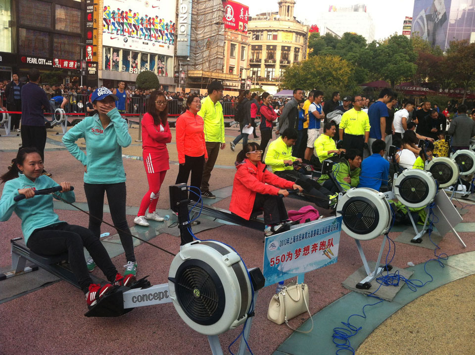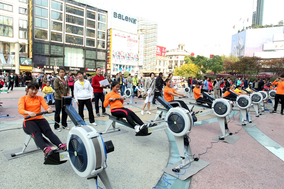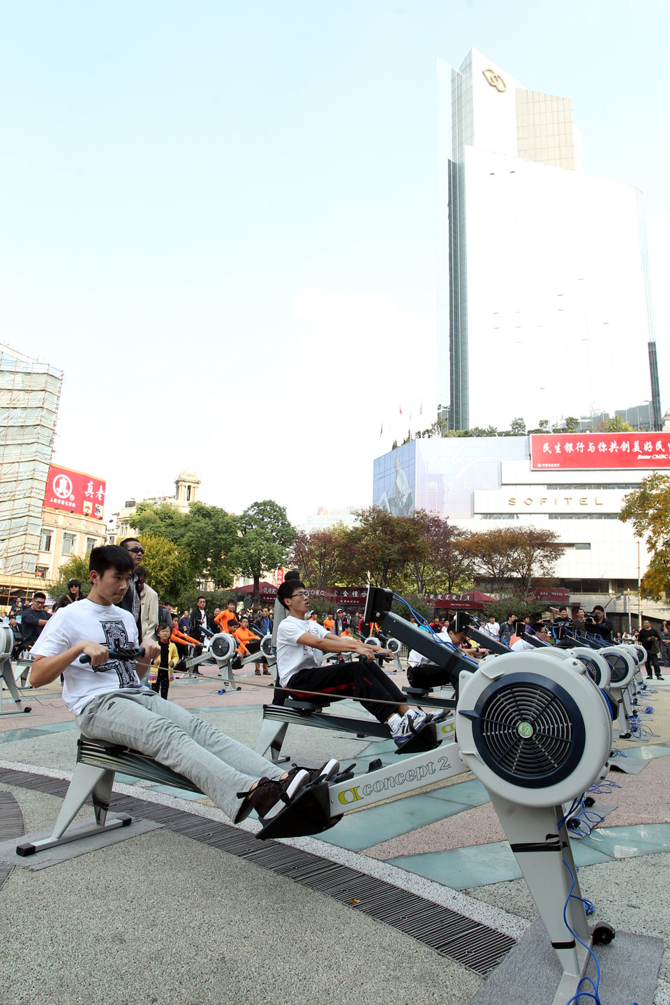 随着市民体育大联赛进入最后一个月的冲刺阶段,各单项总决赛相继展开,高潮迭起。今天(11月23日)下午,市民体育大联赛陆上划船器总决赛在南京路步行街世纪广场鸣笛开赛。来自全市市级机关、总工会、区县、行业系统、高校的40支队伍,近500名市民选手和青少年运动员同场竞技,共同体验划船器运动带来的快乐。
