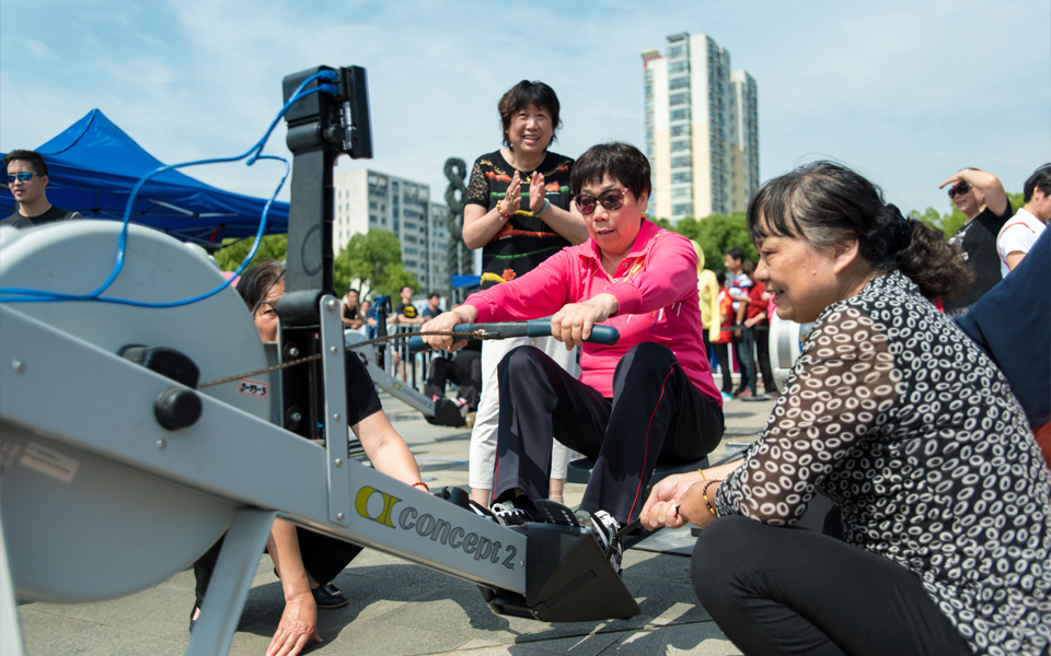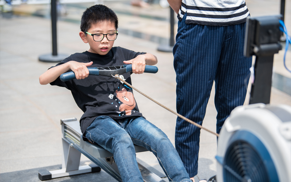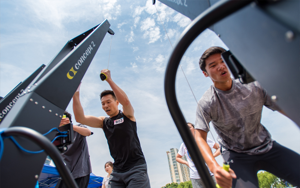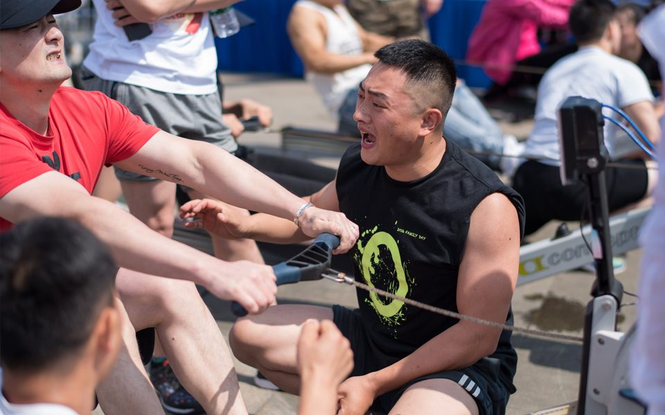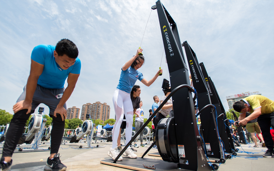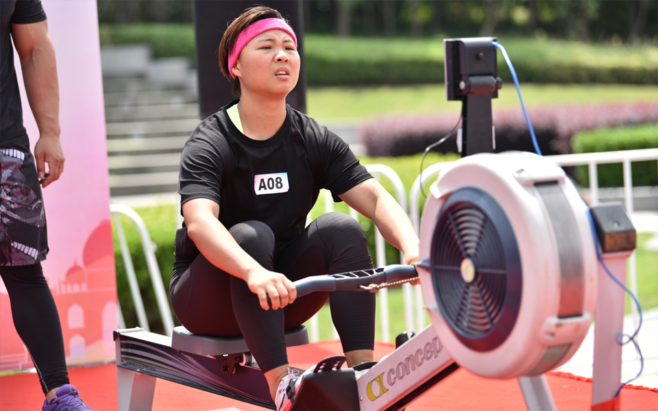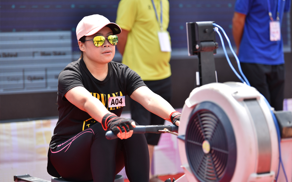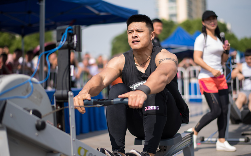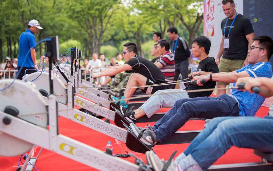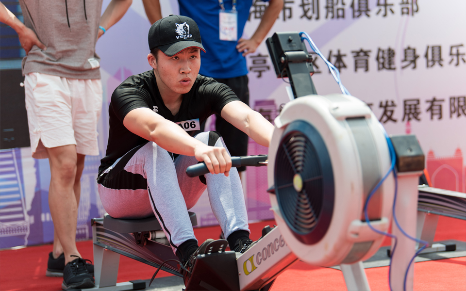 比赛现场,男子个人500米竞速拉开了比赛的序幕,伴随着动感的音乐,选手们在划船器上拉动模拟划桨,上腰、下肢,自如地收缩与伸展,犹如在水上划船一般。连通在划船器上计时装置连通电子大屏,即时反映全部参赛选手比赛用时和排位,让比赛更加激烈。