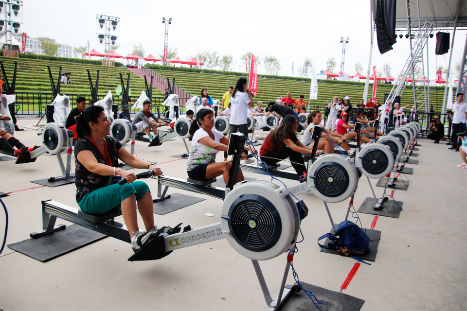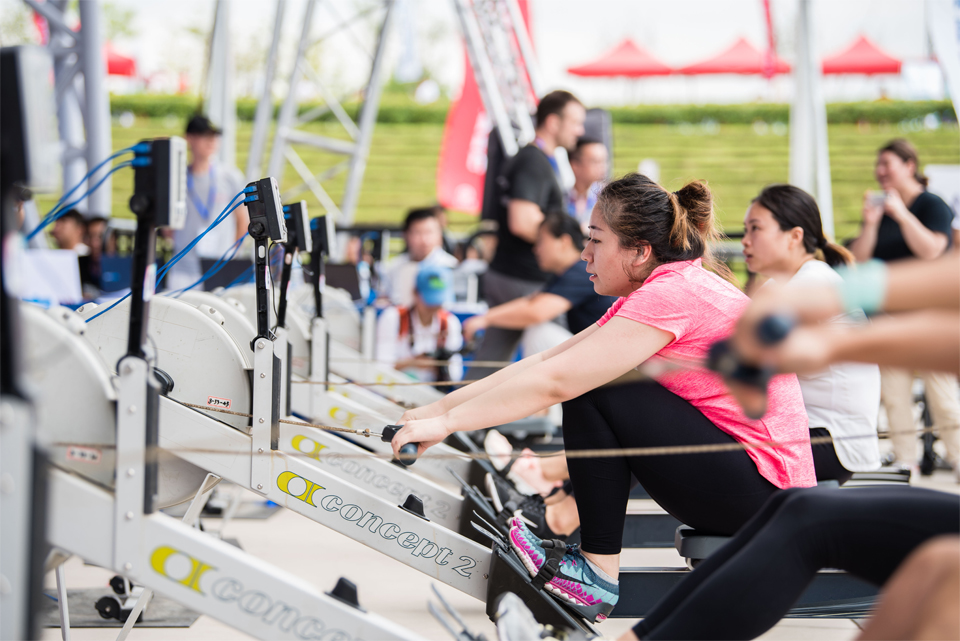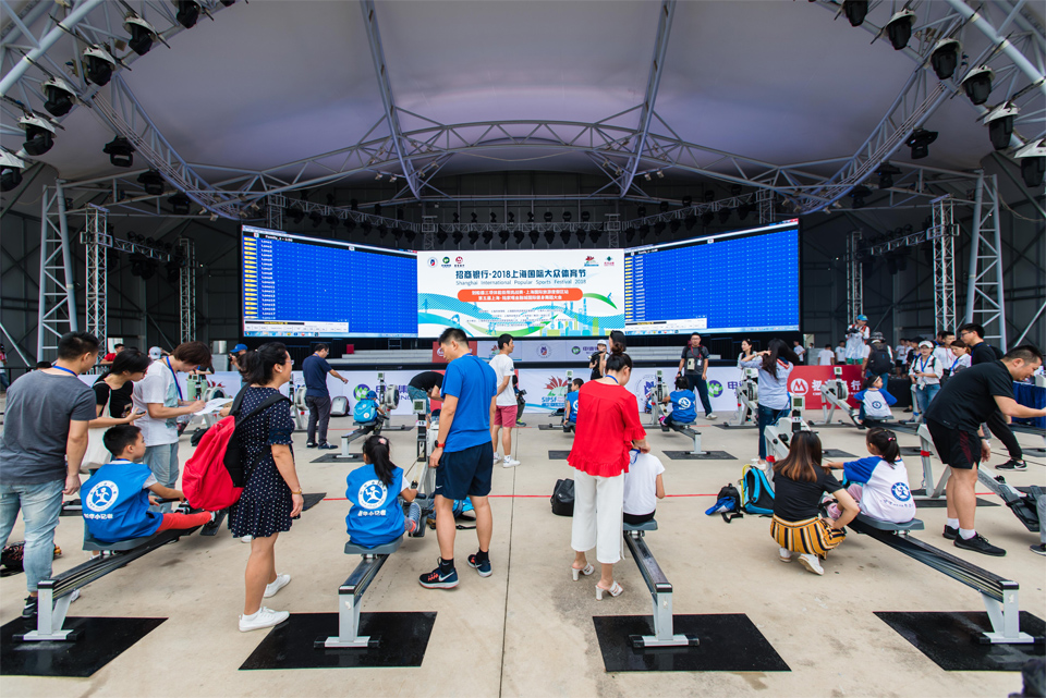 招商银行·2018上海国际大众体育节–划船器三项体能极限挑战赛(上海国际旅游度假区站)于9月22日在上海国际旅游度假区大通广场中心舞台区域开赛。男、女个人三项体能极限挑战赛的赛程距离为1800米,参赛选手需依次连续通过划船器(500米)、动感单车(1000米)和滑雪机(300米)三项器材,完成全部项目,按连续完成全部三项比赛的总用时排名。