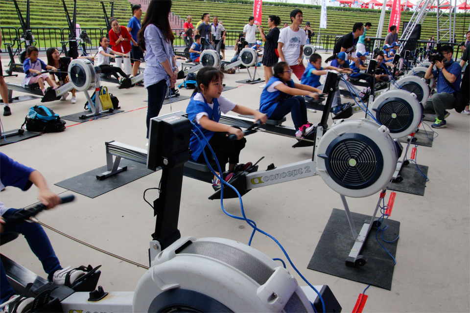 家庭亲子接力比赛要求每个参赛家庭在1分半的比赛时间内,由1名儿童和1名家长通过接力的形式共同完成比赛,按划行距离排名。来自新华小记者和他们的父母、家人,都十分开心并且享受着参加比赛乐趣。
